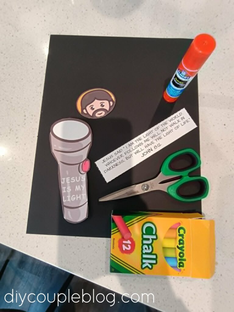 Today I am easily showing you that chalk is not just for outdoor play! This Jesus flashlight craft is great for kids of all ages! Who knew chalk art could be so fun!