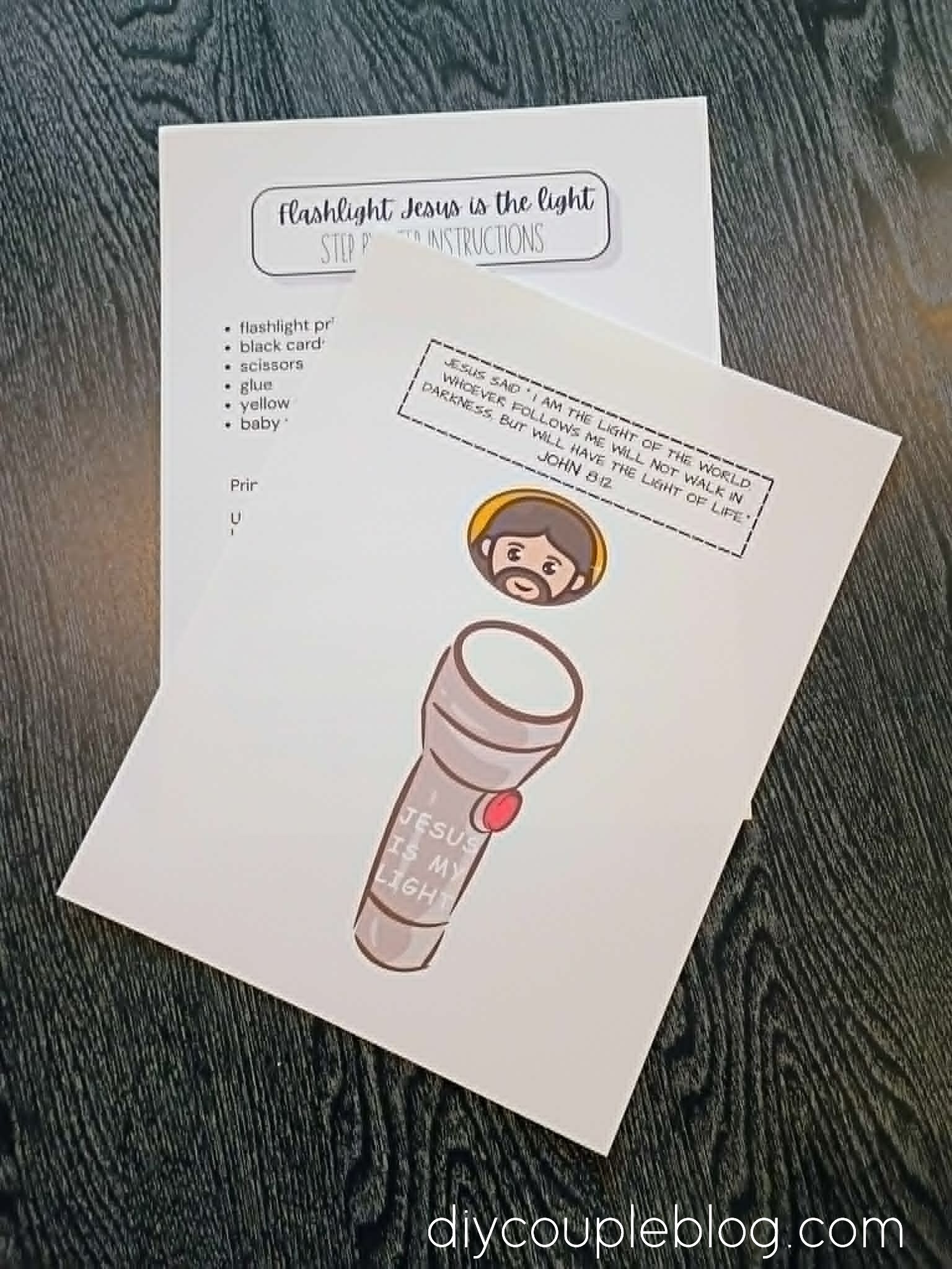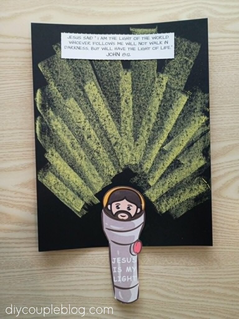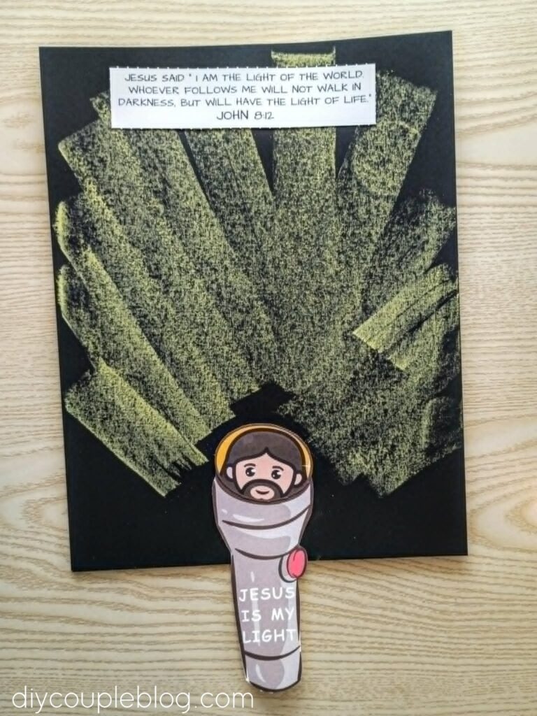 This digital download includes 3 printable images so you can make a shining flashlight in the dark with black cardstock paper imitating the darkness element and the yellow chalk strokes symbolizing the light, while the printable bible verse and the printable image of Jesus make this bible craft faith based.