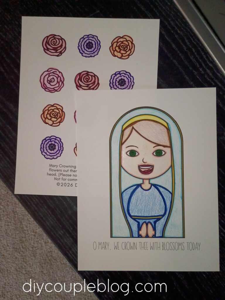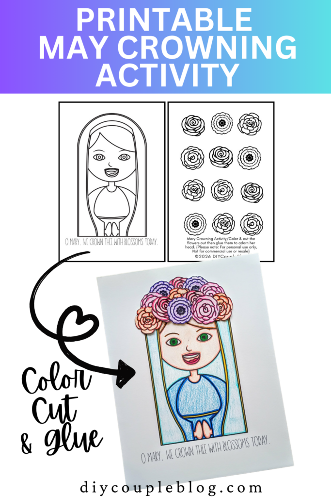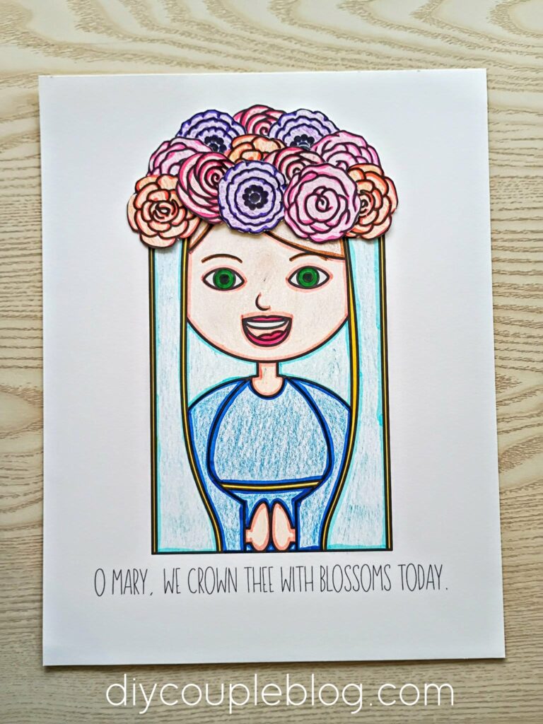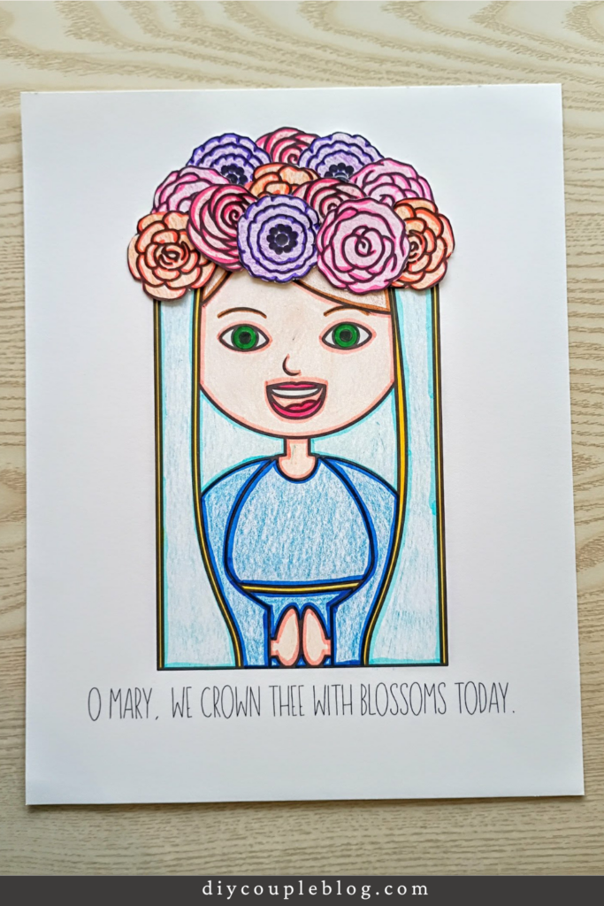 When they get done coloring, they just cut and glue. After the kids finish crowning her head with flowers, they can showcase their Mother Mary Crowning artwork in their favorite spot in the home so she can be cherished throughout the month of May.