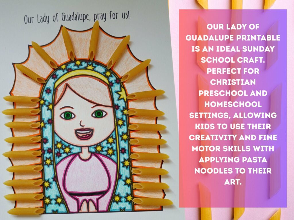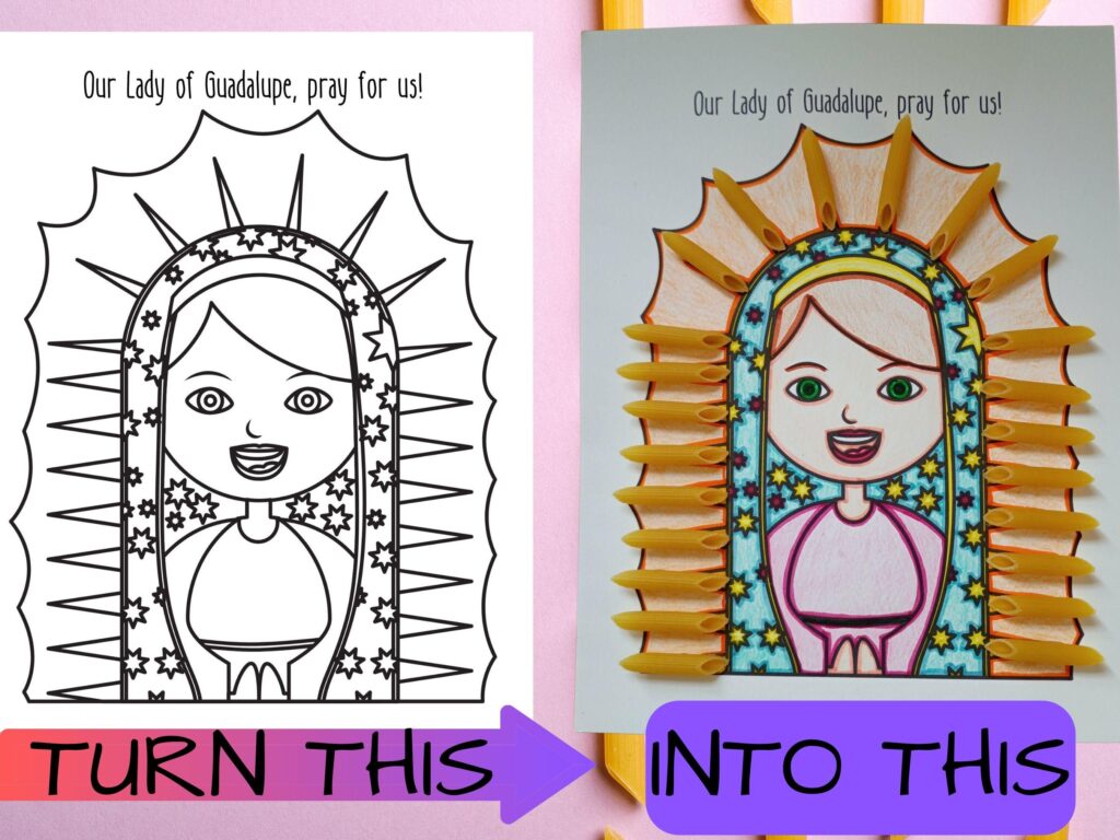 Our lady of Guadalupe pasta craft is a great way to celebrate Our Lady of Guadalupe feast day which is December 12th and honors the Catholic tradition of the miraculous apparition of the Virgin Mary to Juan Diego in 1531.